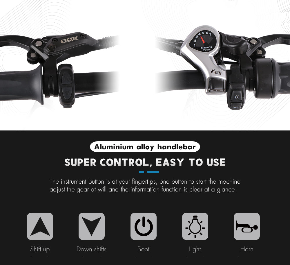 Prasino Snow Electric Bike is not only an excellent professional snow bike, but it is also equipped with a powerful motor, Shimano 7 speed shifter system, Durable battery, an adjustable and lockable aluminum suspension fork that converts forward power in climbing or riding on the road, making the entire drivetrain smooth and durable. Whether it's off-road hills, jungle trails or city roads, snow, and beaches.