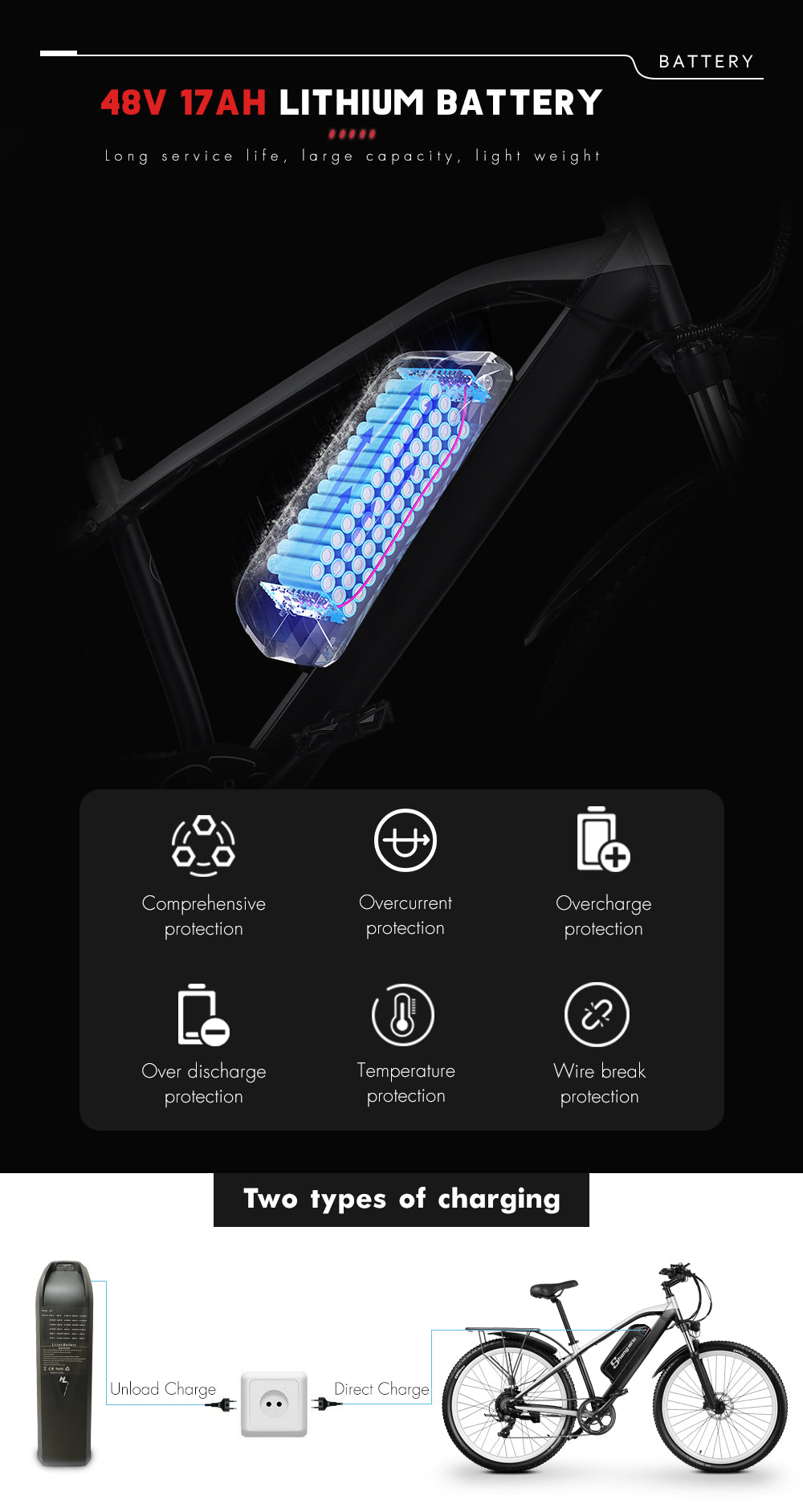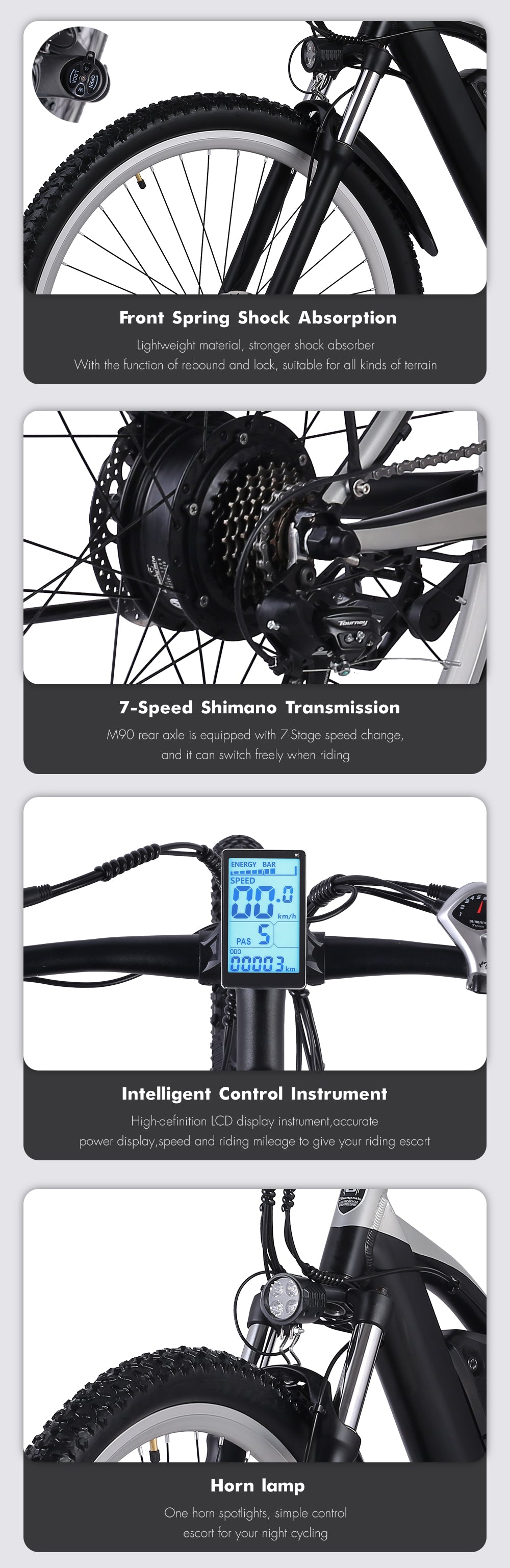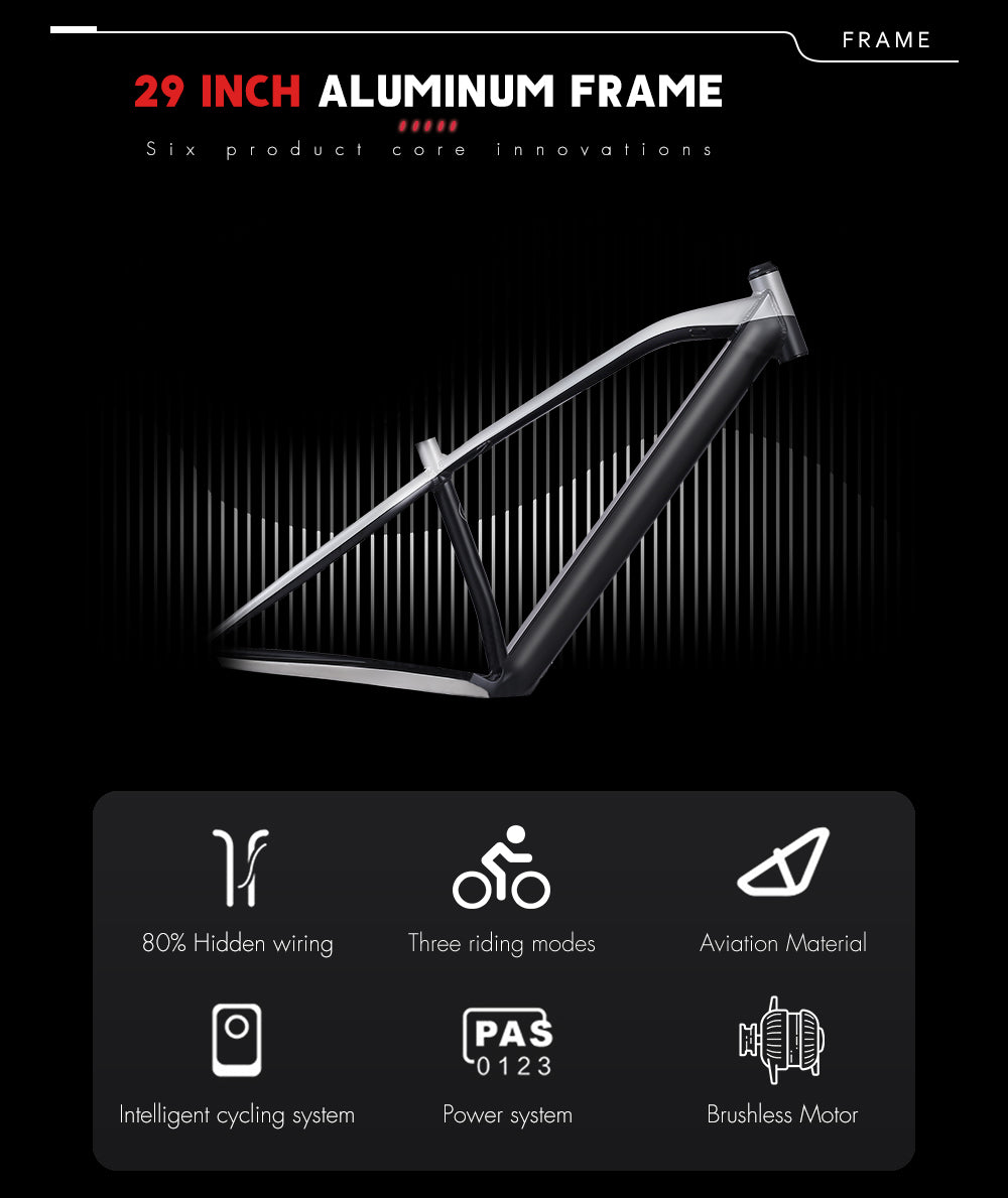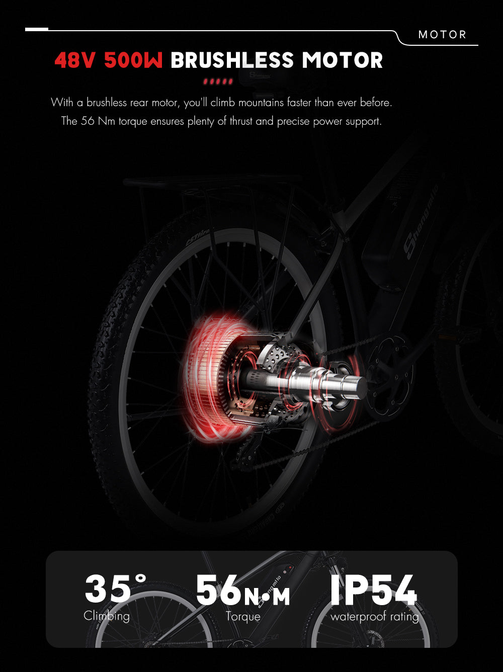 Shengmilo M90 is a capable mountain electric bike with a traditional 29-inch frame. Its frame design alone sets it unique from the market's competitors. The 500W engine on the mountain e-bike is waterproof to IP54. Suspension on the Shengmilo mountain electric bike makes it ideal for off-road riding.